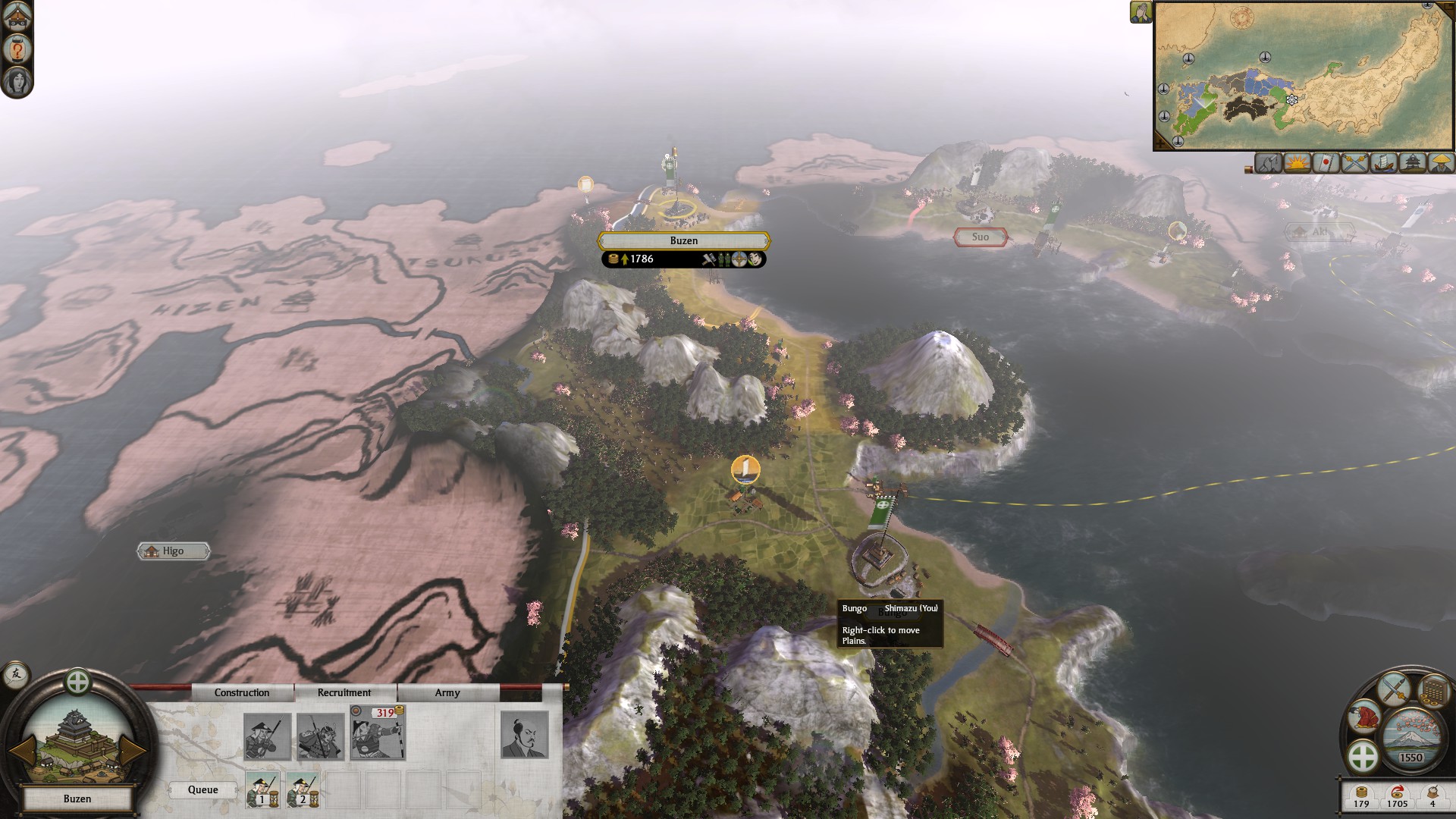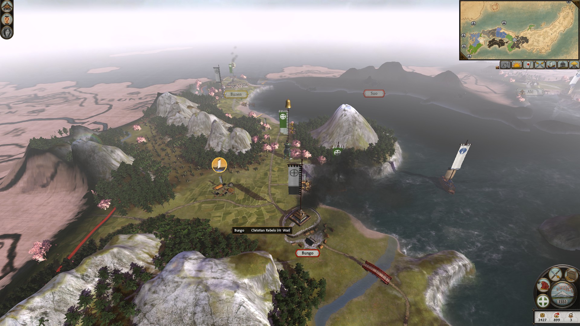 This is where Shoguns religion mechanics began hammering in my coffin’s nails. As I’d been dispatching troops from neighbouring Bungo to reinforce my main army the local Christian population took it as an opportunity to rise up against their Buddhist oppressors. Given that whenever the game gave me the choice to either spare of execute local Christian preachers I can understand why. Two moderately sized armies appeared in both Bungo and Buzen provinces. They pounced on the heroic defenders of Bungo who and with my small reinforcing army still 4 seasons away I threw in the towel.