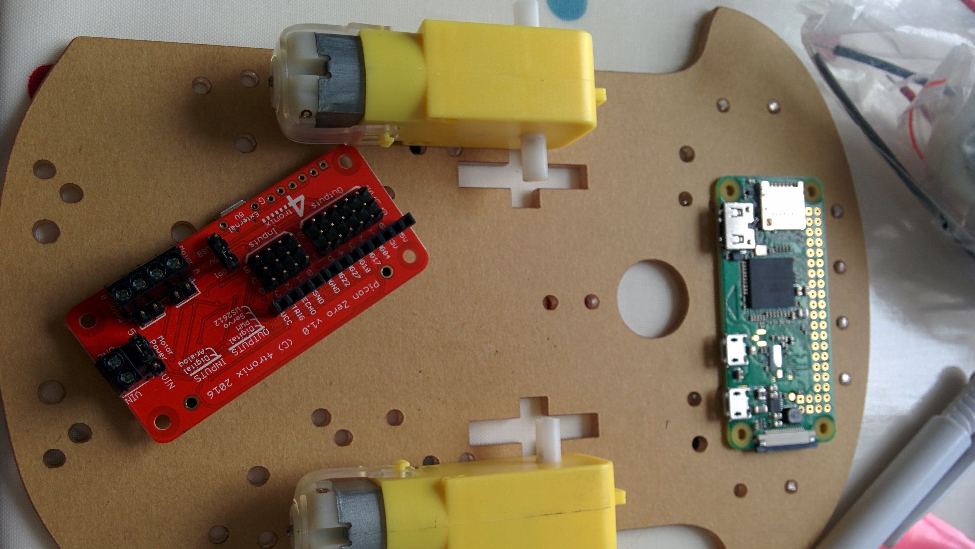 My initial plan is to build a small two wheeled rover that I can control using the arrow keys of my computer. The new Raspberry Pi Zero W is absurdly small and includes wifi and bluetooth which makes it perfect for this type of project. Hunting around on amazon I found this platform with two motors and a caster which is ideal. To provide PWM control to these motors I’m using the Picon Zero hat which has two outputs for motors and additional inputs and outputs for adding sensors and servers in future.