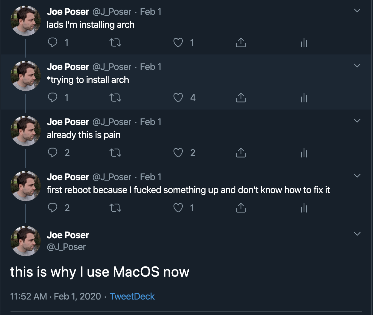 I’ve never installed Arch and having had colleagues and friends always tell me that they use it at home it’s something that I felt the need to try mostly to prove to myself that I could also use it at home if I could be bothered to.