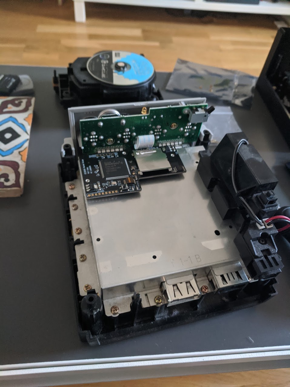 Once you have the drive assembly off you just remove the screws holding it to it’s mounting plate and replace it with the tiny little GC-Loader board. Then you slot it back into place, replace the screws and that’s about it.
